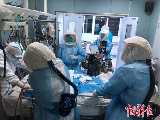 3月9日,在金銀潭南樓的重癥ICU病房內(nèi),醫(yī)護(hù)人員正在對一名呼吸困難的新冠肺炎患者進(jìn)行纖支鏡手術(shù)。