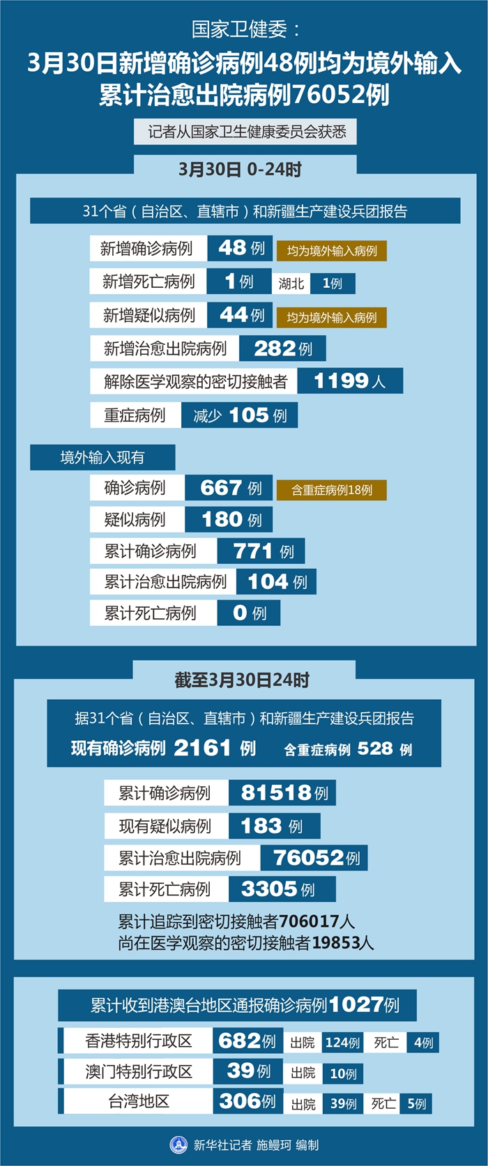 新華社北京3月31日電(記者劉羊旸、王秉陽)記者31日從國家衛(wèi)生健康委員會(huì)了解到,3月30日0—24時(shí),31個(gè)?。ㄗ灾螀^(qū)、直轄市)和新疆生產(chǎn)建設(shè)兵團(tuán)報(bào)告新增確診病例48例,均為境外輸入病例;新增死亡病例1例(湖北1例);新增疑似病例44例,均為境外輸入病例。