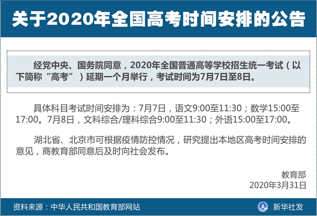 新華社北京3月31日電(記者施雨岑)記者31日從教育部獲悉,經黨中央、國務院同意,2020年全國普通高等學校招生統(tǒng)一考試延期一個月舉行,考試時間為7月7日至8日。