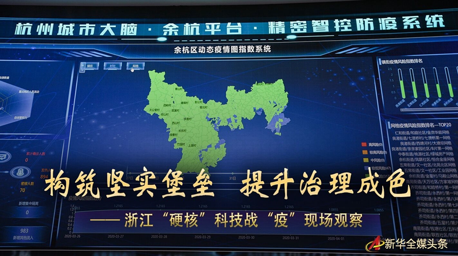 4月2日,在杭州市余杭區(qū)疫情防控工作領(lǐng)導(dǎo)小組指揮部?jī)?nèi),杭州城市大腦精密智控防疫系統(tǒng)顯示疫情防控動(dòng)態(tài)各項(xiàng)實(shí)時(shí)數(shù)據(jù)。新華社記者 徐昱 攝