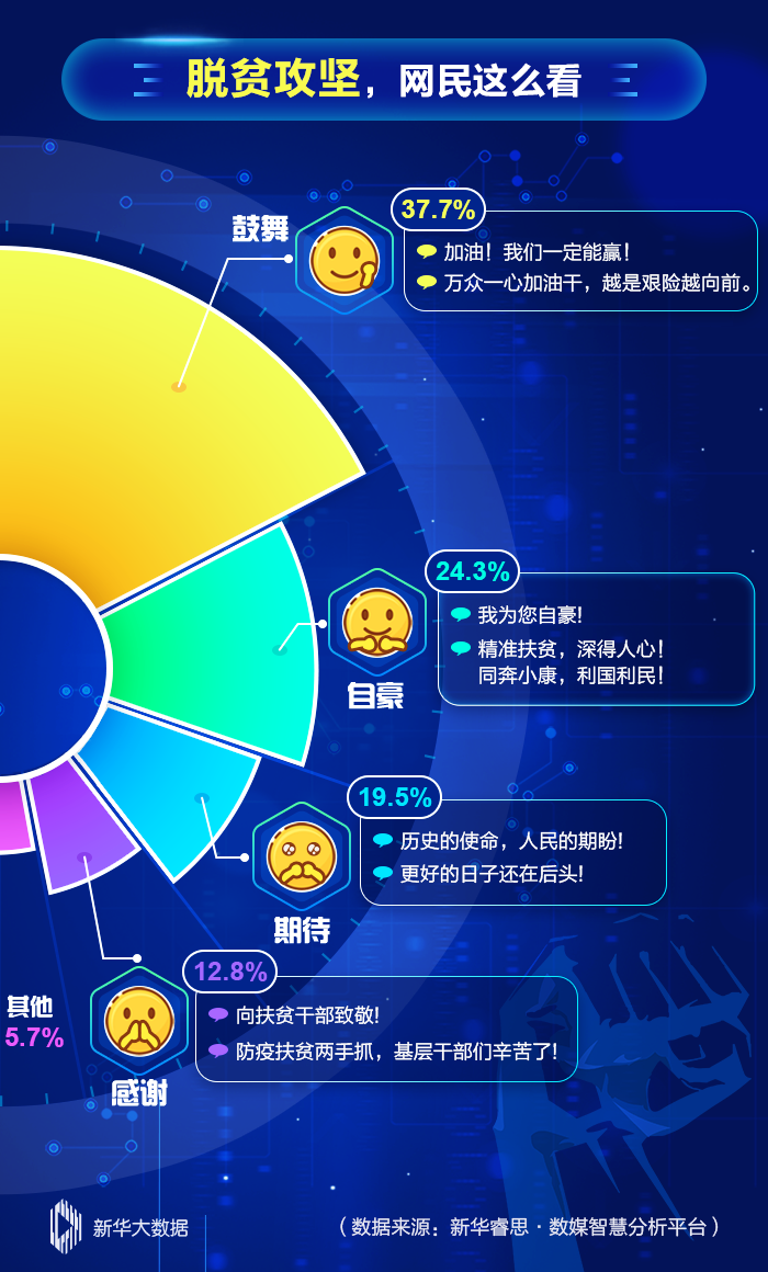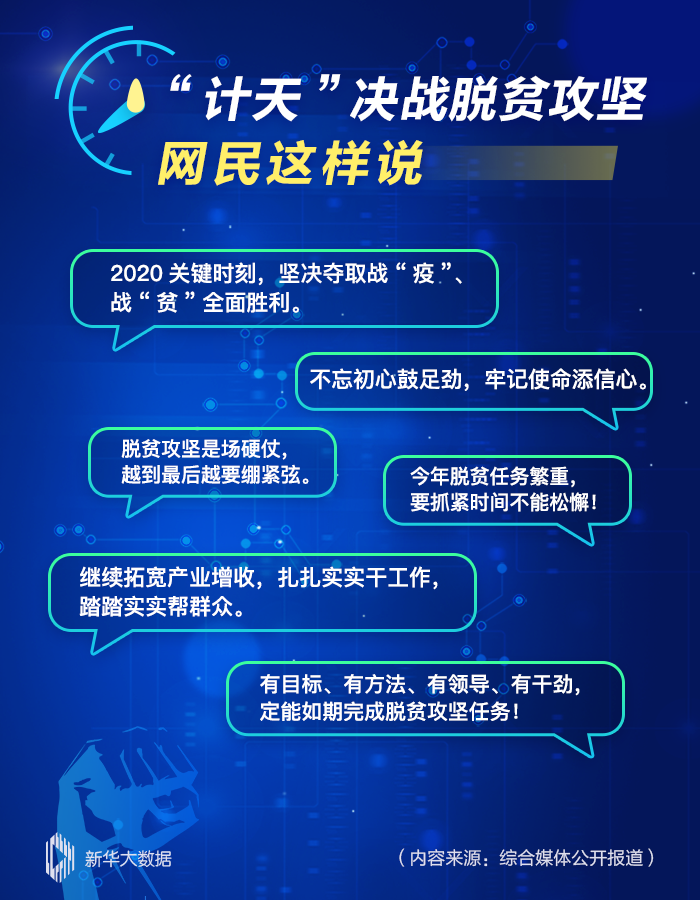 數(shù)據(jù)顯示,倒計時沖鋒之際,網(wǎng)民對脫貧攻堅非常關(guān)注。有網(wǎng)民留言稱:今年脫貧任務繁重,要抓緊時間不能松懈;也有網(wǎng)民留言表示要扎扎實實干工作;還有網(wǎng)民留言表達對完成目標任務的信心:2020關(guān)鍵時刻,堅決奪取戰(zhàn)“疫”、戰(zhàn)“貧”全面勝利。