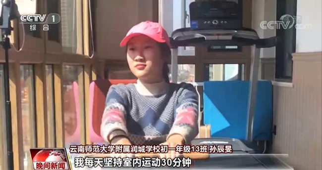 云南師范大學(xué)附屬潤城學(xué)校初一年級13班 孫辰旻:在爸爸的陪伴下,我每天堅持室內(nèi)運動30分鐘,室外運動1小時。體育運動不僅能提升我的身體素質(zhì),還能不斷磨練我的意志,增強我的自信。