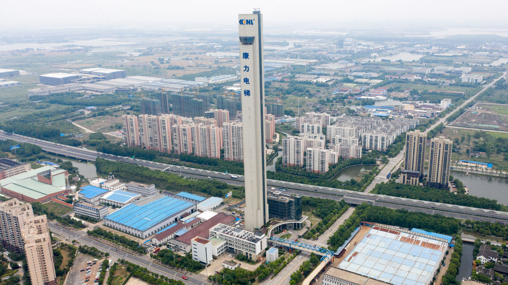 這是5月28日拍攝的江蘇蘇州市吳江區(qū)汾湖高新區(qū)的康力電梯試驗塔(無人機照片)。新華社記者 李博 攝