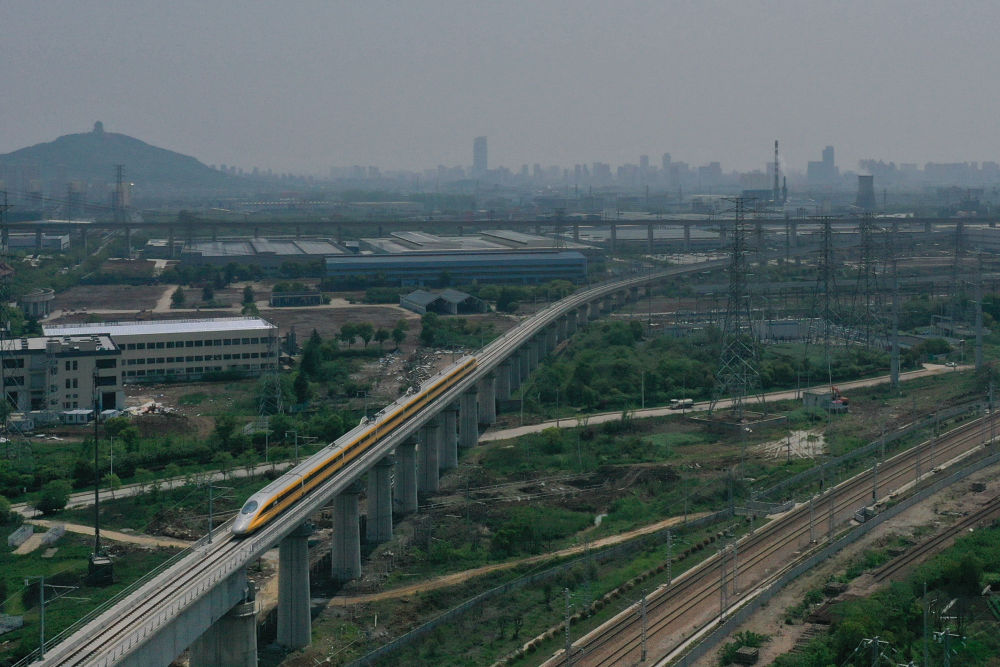 4月22日,在商合杭高鐵合肥至湖州段,聯(lián)調(diào)聯(lián)試綜合檢測列車經(jīng)過浙江湖州境內(nèi)(無人機照片)。新華社記者 黃宗治 攝