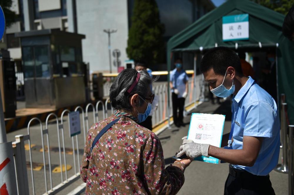 5月11日,在北京市海淀區(qū)的北京市十一學校龍樾實驗中學,初三年級學生進入學校前掃描“健康碼”。新華社記者?任超?攝