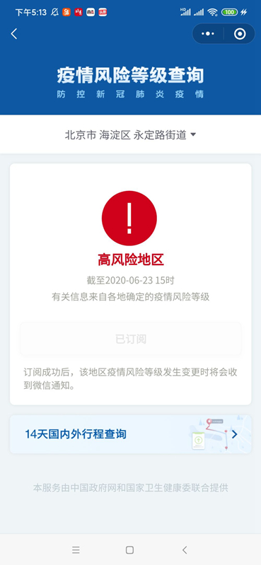 北京又增一個(gè)高風(fēng)險(xiǎn)地區(qū)! 記者從國務(wù)院客戶端小程序“疫情風(fēng)險(xiǎn)等級查詢”上了解到,截至6月23日15時(shí),北京市海淀區(qū)永定路街道由中風(fēng)險(xiǎn)調(diào)整為高風(fēng)險(xiǎn)。