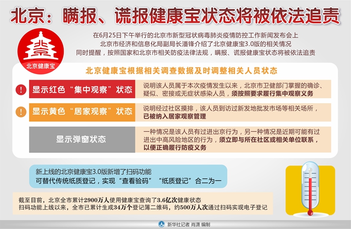 新華社北京6月25日電(記者魯暢)在25日下午舉行的北京市新型冠狀病毒肺炎疫情防控工作新聞發(fā)布會上,北京市經(jīng)濟和信息化局副局長潘鋒介紹了北京健康寶3.0版的相關(guān)情況,同時提醒,按照國家和北京市相關(guān)防疫法律法規(guī),瞞報、謊報健康寶狀態(tài)將被依法追責(zé)。