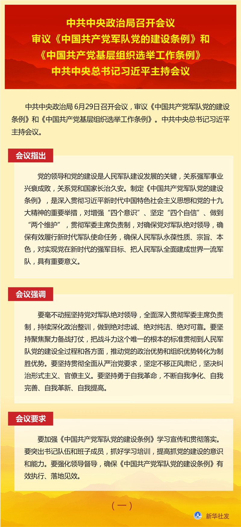 新華社北京6月29日電? 中共中央政治局6月29日召開(kāi)會(huì)議,審議《中國(guó)共產(chǎn)黨軍隊(duì)黨的建設(shè)條例》和《中國(guó)共產(chǎn)黨基層組織選舉工作條例》。中共中央總書(shū)記習(xí)近平主持會(huì)議。