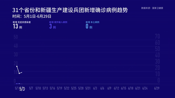 6月29日0—24時,31個?。ㄗ灾螀^(qū)、直轄市)和新疆生產(chǎn)建設(shè)兵團報告新增確診病例19例,其中境外輸入病例11例(廣東4例,上海3例,四川3例,甘肅1例),本土病例8例(北京7例,上海1例);無新增死亡病例;新增疑似病例1例,為境外輸入病例(在上海)。