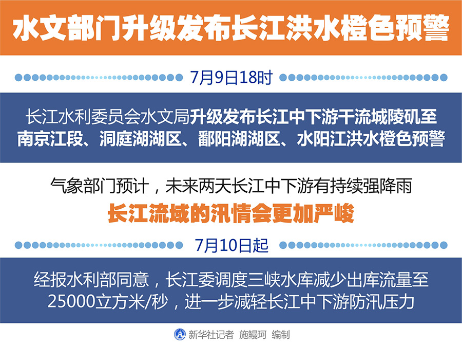 新華社武漢7月9日電(記者李思遠(yuǎn)、樂文婉)長(zhǎng)江水利委員會(huì)水文局9日18時(shí)升級(jí)發(fā)布長(zhǎng)江中下游干流城陵磯至南京江段、洞庭湖湖區(qū)、鄱陽(yáng)湖湖區(qū)、水陽(yáng)江洪水橙色預(yù)警。水文部門提醒,有關(guān)單位和公眾務(wù)必注意防范日益嚴(yán)峻的汛情。