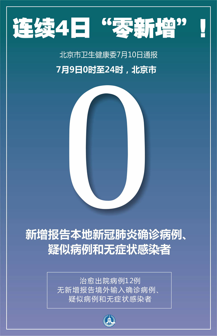 新華社北京7月10日電(記者俠克)北京市衛(wèi)生健康委10日通報(bào),7月9日0時(shí)至24時(shí),北京市無新增報(bào)告本地新冠肺炎確診病例、疑似病例和無癥狀感染者,治愈出院病例12例;無新增報(bào)告境外輸入確診病例、疑似病例和無癥狀感染者。