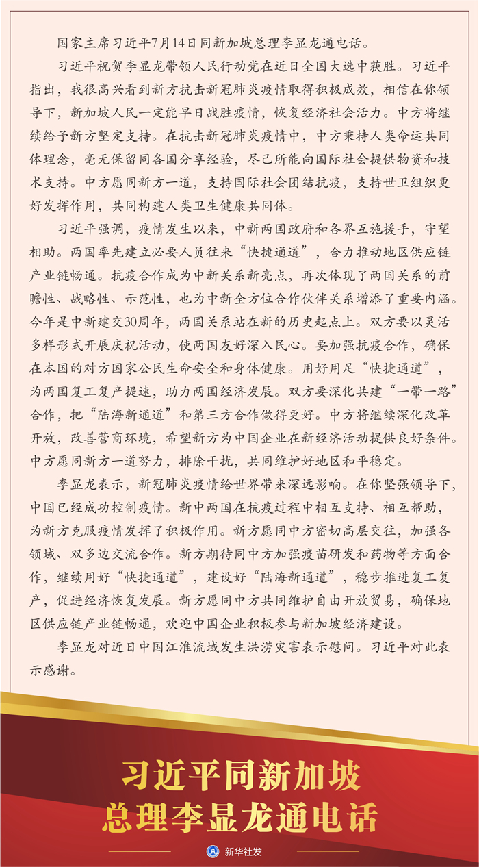 新華社北京7月14日電 國(guó)家主席習(xí)近平7月14日同新加坡總理李顯龍通電話。