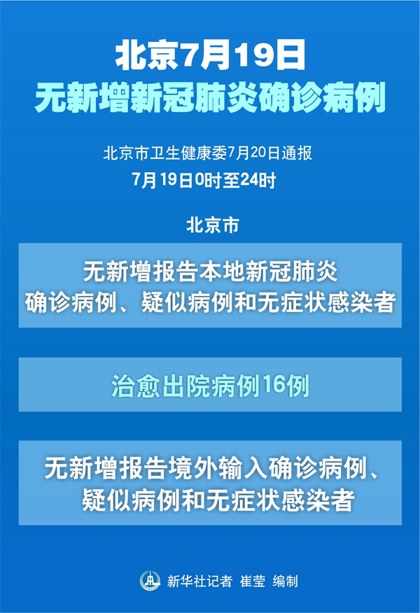 新華社北京7月20日電(記者俠克)北京市衛(wèi)生健康委20日通報(bào),7月19日0時(shí)至24時(shí),北京市無(wú)新增報(bào)告本地新冠肺炎確診病例、疑似病例和無(wú)癥狀感染者,治愈出院病例16例;無(wú)新增報(bào)告境外輸入確診病例、疑似病例和無(wú)癥狀感染者。