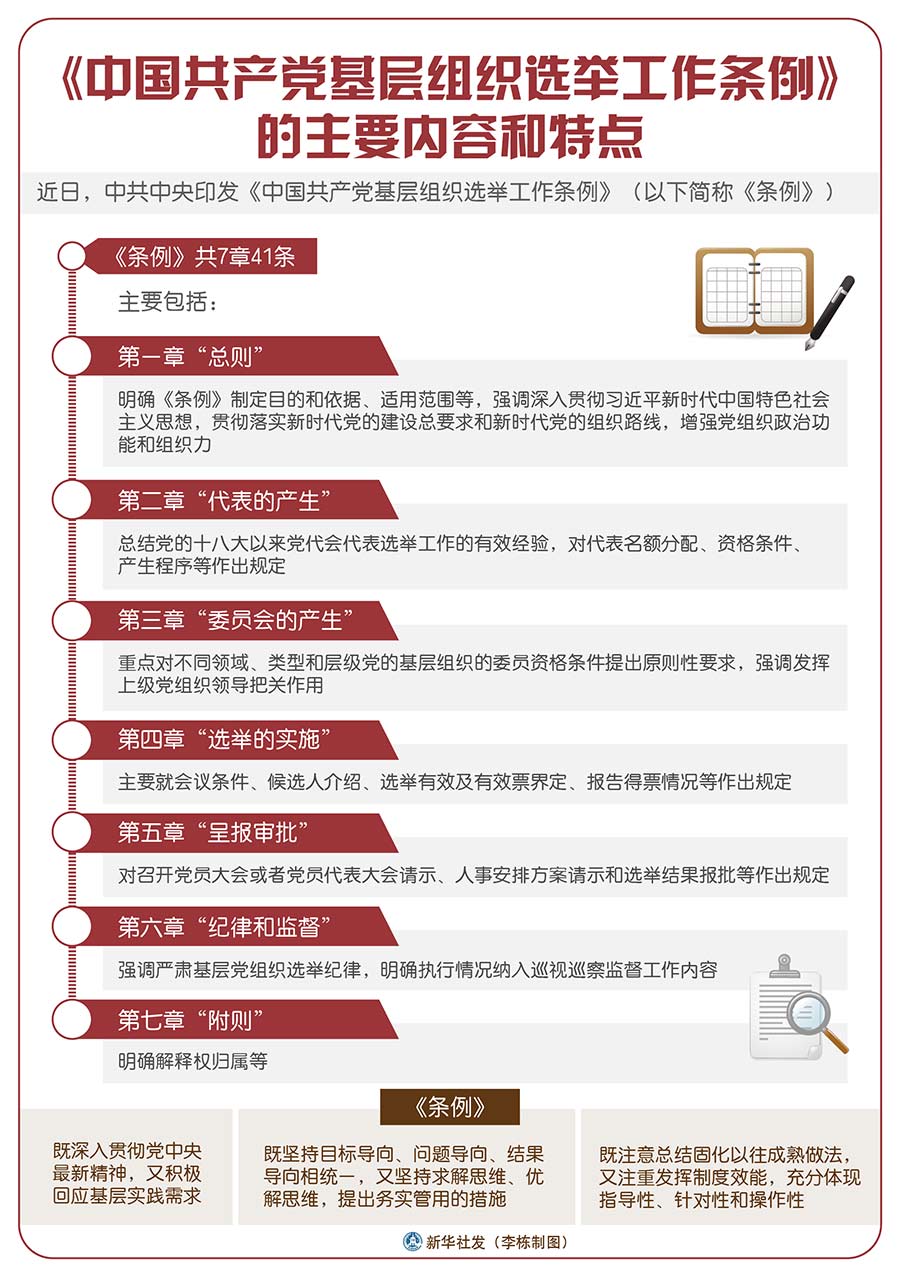 答:《條例》共7章41條,主要包括:第一章“總則”,明確《條例》制定目的和依據(jù)、適用范圍等,強(qiáng)調(diào)深入貫徹習(xí)近平新時(shí)代中國特色社會主義思想,貫徹落實(shí)新時(shí)代黨的建設(shè)總要求和新時(shí)代黨的組織路線,增強(qiáng)黨組織政治功能和組織力。第二章“代表的產(chǎn)生”,總結(jié)黨的十八大以來黨代會代表選舉工作的有效經(jīng)驗(yàn),對代表名額分配、資格條件、產(chǎn)生程序等作出規(guī)定。第三章“委員會的產(chǎn)生”,重點(diǎn)對不同領(lǐng)域、類型和層級黨的基層組織的委員資格條件提出原則性要求,強(qiáng)調(diào)發(fā)揮上級黨組織領(lǐng)導(dǎo)把關(guān)作用。第四章“選舉的實(shí)施”,主要就會議條件、候選人介紹、選舉有效及有效票界定、報(bào)告得票情況等作出規(guī)定。第五章“呈報(bào)審批”,對召開黨員大會或者黨員代表大會請示、人事安排方案請示和選舉結(jié)果報(bào)批等作出規(guī)定。第六章“紀(jì)律和監(jiān)督”,強(qiáng)調(diào)嚴(yán)肅基層黨組織選舉紀(jì)律,明確執(zhí)行情況納入巡視巡察監(jiān)督工作內(nèi)容。第七章“附則”,明確解釋權(quán)歸屬等。