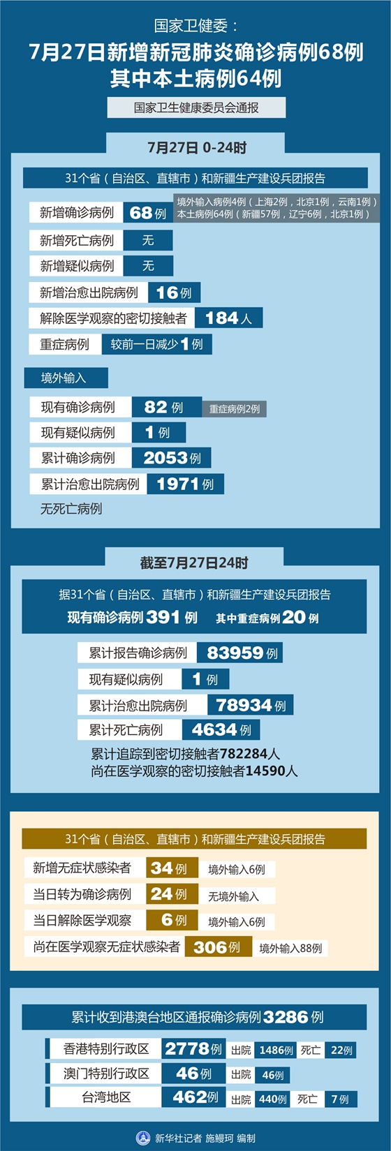 截至7月27日24時(shí),據(jù)31個(gè)?。ㄗ灾螀^(qū)、直轄市)和新疆生產(chǎn)建設(shè)兵團(tuán)報(bào)告,現(xiàn)有確診病例391例(其中重癥病例20例),累計(jì)治愈出院病例78934例,累計(jì)死亡病例4634例,累計(jì)報(bào)告確診病例83959例,現(xiàn)有疑似病例1例。累計(jì)追蹤到密切接觸者782284人,尚在醫(yī)學(xué)觀察的密切接觸者14590人。