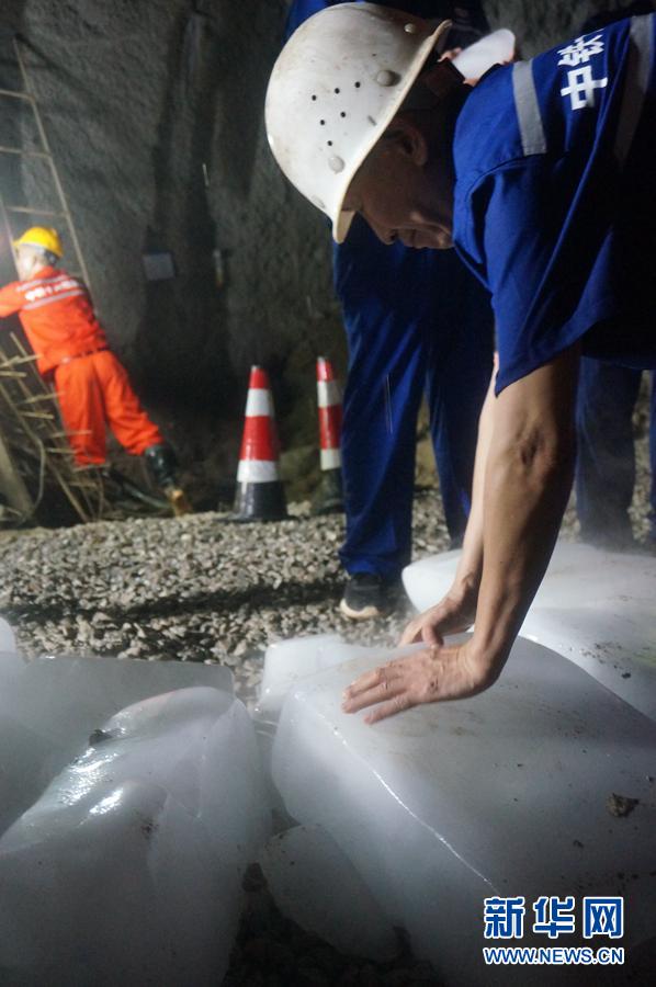 隧道內的溫度高達40攝氏度,結束作業(yè)的工人在用冰塊降溫。新華網記者劉瓊 攝