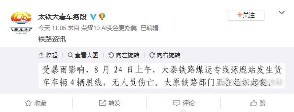 據(jù)大秦車務段官方微博消息,受暴雨影響,8月24日上午,大秦鐵路煤運專線涿鹿站發(fā)生貨車車輛4輛脫線,無人員傷亡,太原鐵路部門正在組織修復。