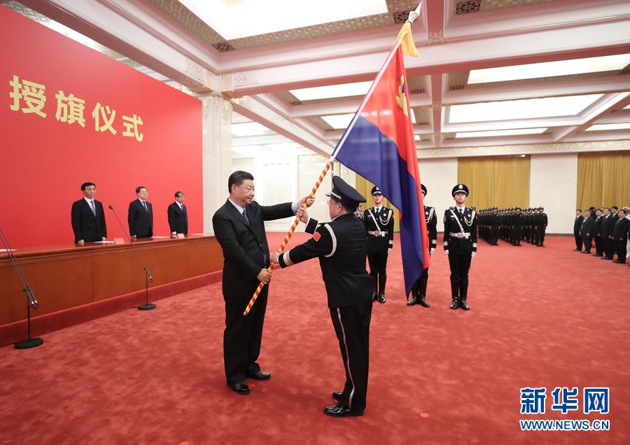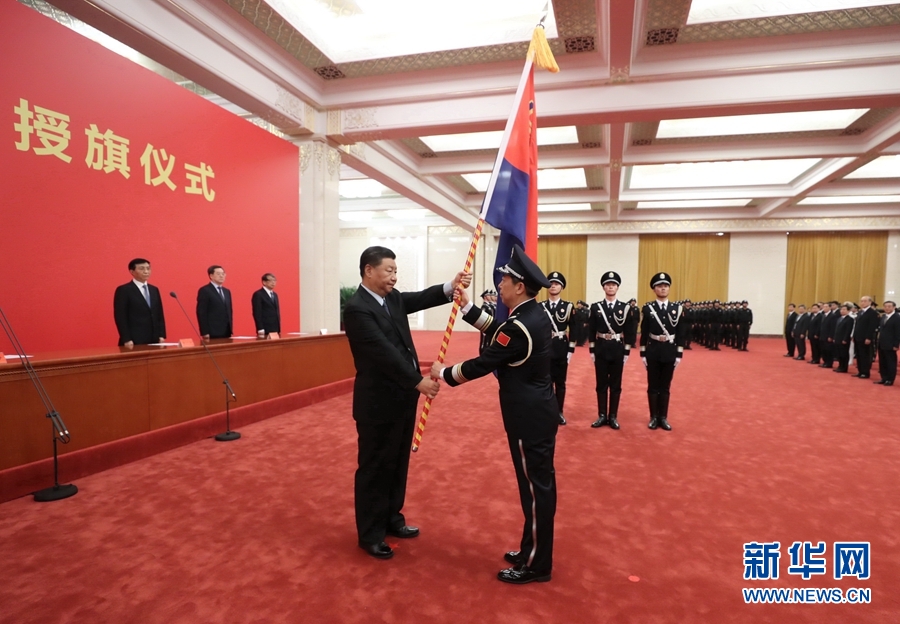 8月26日,中國人民警察警旗授旗儀式在人民大會(huì)堂舉行。中共中央總書記、國家主席、中央軍委主席習(xí)近平向中國人民警察隊(duì)伍授旗并致訓(xùn)詞。這是習(xí)近平向中國人民警察隊(duì)伍授旗。 新華社記者 鞠鵬 攝