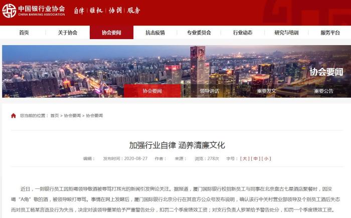 8月24日,廈門(mén)國(guó)際銀行北京分行發(fā)文證實(shí)此事并致歉。該行表示,員工楊某反映的中關(guān)村支行營(yíng)業(yè)部某領(lǐng)導(dǎo)及該支行個(gè)別員工在私下非公款聚餐中,確系存在因酒后失態(tài)而對(duì)楊某做出言語(yǔ)及行為失當(dāng)?shù)扰e動(dòng),上述行為確實(shí)對(duì)其本人造成了影響和傷害,對(duì)此深表歉意。