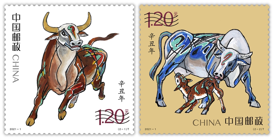 《辛丑年》特種郵票由著名畫家姚鐘華先生創(chuàng)作,延續(xù)了第四輪生肖郵票的“家國”理念。第一枚名為“奮發(fā)圖強”,描繪了雄壯有力、一往無前的奔牛形象。公牛四蹄揚起,昂首向前,目光炯炯,表達出不畏艱險、砥礪前行,為實現(xiàn)中華民族偉大復興而努力奮斗的寓意。第二枚名為“牛年大吉”,通過大牛與小牛舐犢情深的溫馨畫面,向全國人民傳遞家庭興旺和諧、團圓美滿的美好祝愿。