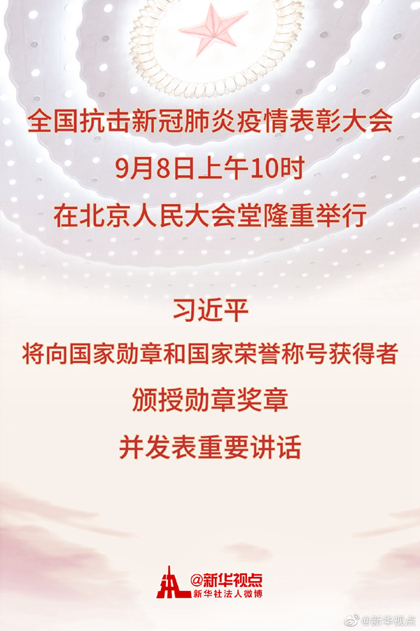 新華社北京9月6日電? 全國(guó)抗擊新冠肺炎疫情表彰大會(huì)將于9月8日上午10時(shí)在北京人民大會(huì)堂隆重舉行。中共中央總書記、國(guó)家主席、中央軍委主席習(xí)近平將向國(guó)家勛章和國(guó)家榮譽(yù)稱號(hào)獲得者頒授勛章獎(jiǎng)?wù)虏l(fā)表重要講話。