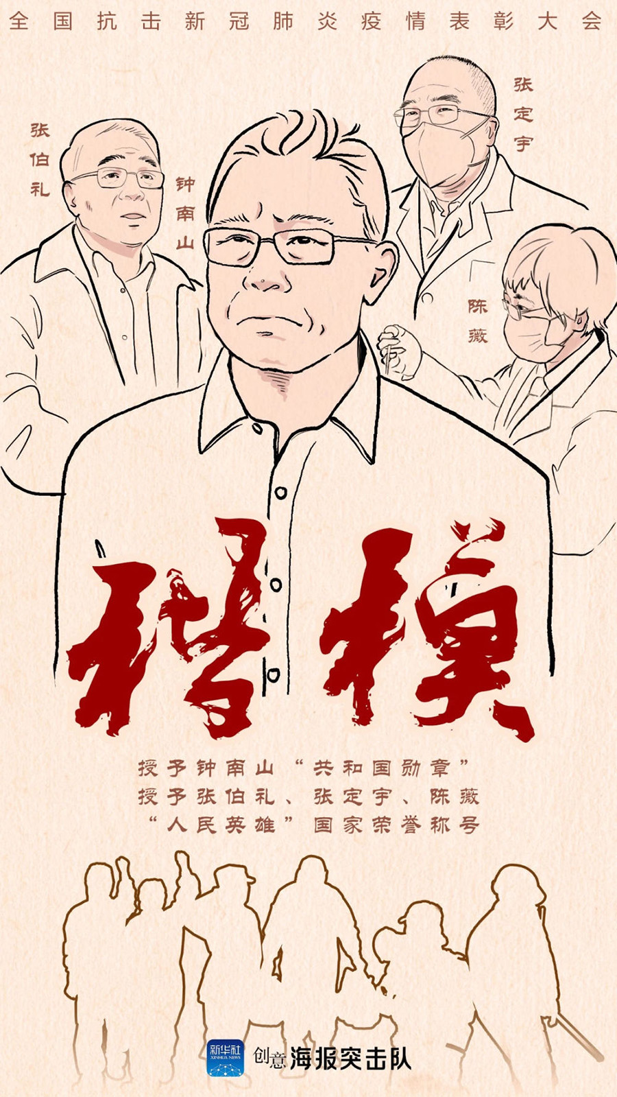 9月8日,全國抗擊新冠肺炎疫情表彰大會在北京人民大會堂隆重舉行。中共中央總書記、國家主席、中央軍委主席習(xí)近平向“共和國勛章”獲得者鐘南山(前排右二),“人民英雄”國家榮譽稱號獲得者張伯禮(前排左二)、張定宇(前排右一)、陳薇(前排左一)頒授勛章獎?wù)隆?新華社記者 謝環(huán)馳 攝