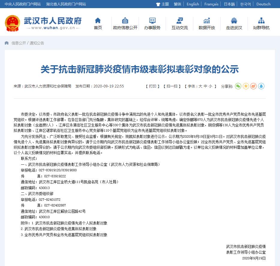 據(jù)武漢市人民政府網(wǎng)站消息,9月19日,武漢市抗擊新冠肺炎疫情表彰工作領導小組辦公室發(fā)布關于抗擊新冠肺炎疫情市級表彰擬表彰對象的公示,確定張鵬等870人為武漢市抗擊新冠肺炎疫情先進個人擬表彰對象(含追授2人)。