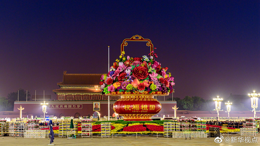 據(jù)悉,大花籃以喜慶的花果籃為主景,花籃為鋼架結(jié)構(gòu),籃身為玻璃鋼材質(zhì),籃盤直徑12米,花壇底部直徑45米。在籃體南側(cè)書寫“祝福祖國(guó),1949-2020”字樣,在籃體北側(cè)書寫 “萬眾一心,1949-2020”字樣。籃內(nèi)共使用了125枝大型仿真花,籃底部花壇則使用我國(guó)自育花園小菊“絢秋星光”與一品紅組成10顆紅心的圖案。
