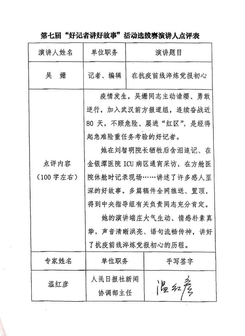 同時,她深入醫(yī)院、社區(qū)、火車站等現(xiàn)場進行直播,為網(wǎng)友實時播報抗疫一線進展和舉措。在漢期間,她總計采寫制作出50篇形式多樣的新聞產(chǎn)品。2020年,吳姍獲得“人民日報社抗擊新冠肺炎疫情先進個人”、“人民日報社第十二屆青年崗位能手”表彰。