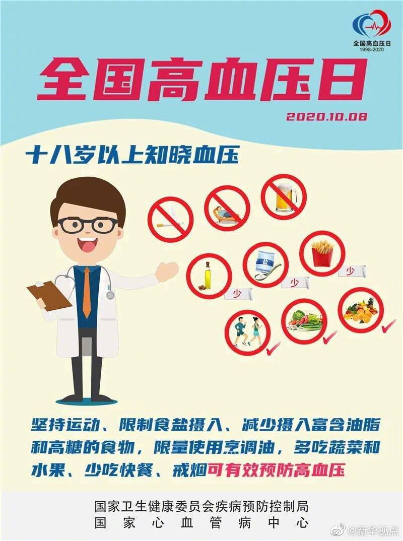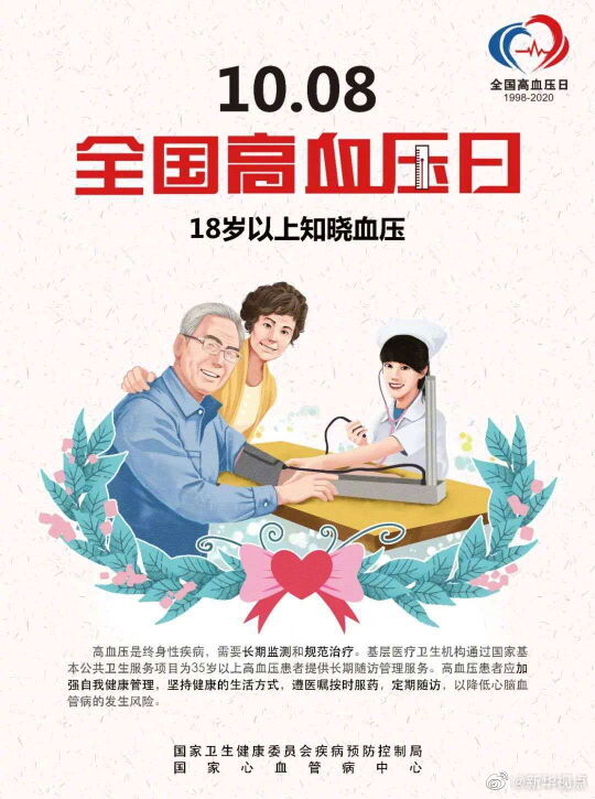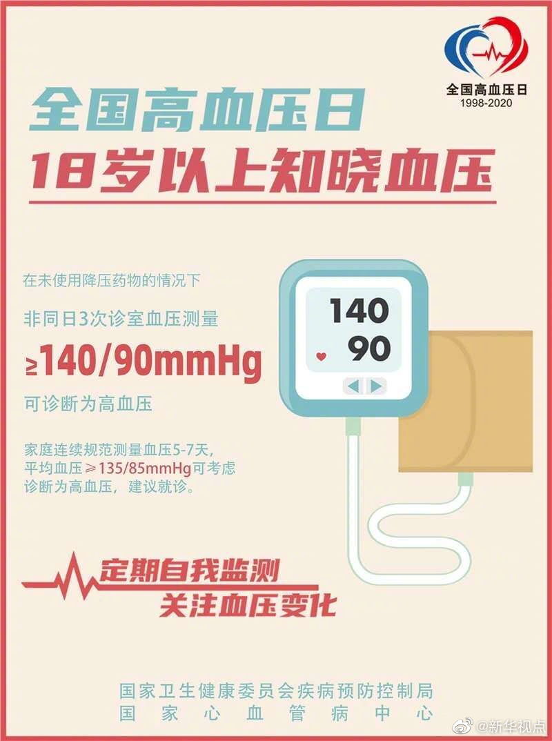 10月8日是全國高血壓日,今年的主題是“18歲以上知曉血壓”。根據(jù)國家心血管病中心的數(shù)據(jù),我國已有2.7億高血壓患者,因心血管病導(dǎo)致的死亡占國民總死亡的40%以上,約70%的腦卒中死亡、約50%心肌梗死與高血壓密切相關(guān)。國家心血管病中心提醒,高血壓并非老年人“專屬”,年輕化成為高血壓的發(fā)展趨勢。18歲及以上人群就應(yīng)定期自我監(jiān)測血壓,至少每年測量一次。在未使用降壓藥物的情況下,非同日3次血壓測量的收縮壓≥140mmHg和(或)舒張壓≥90mmHg,可診斷為高血壓。(記者屈婷)