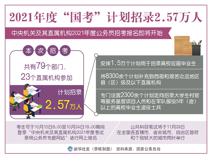 新華社北京10月14日電(記者林暉)記者14日從國家公務(wù)員局獲悉,中央機關(guān)及其直屬機構(gòu)2021年度公務(wù)員招考報名即將開始,本次招考共有79個部門、23個直屬機構(gòu)參加,計劃招錄2.57萬人。