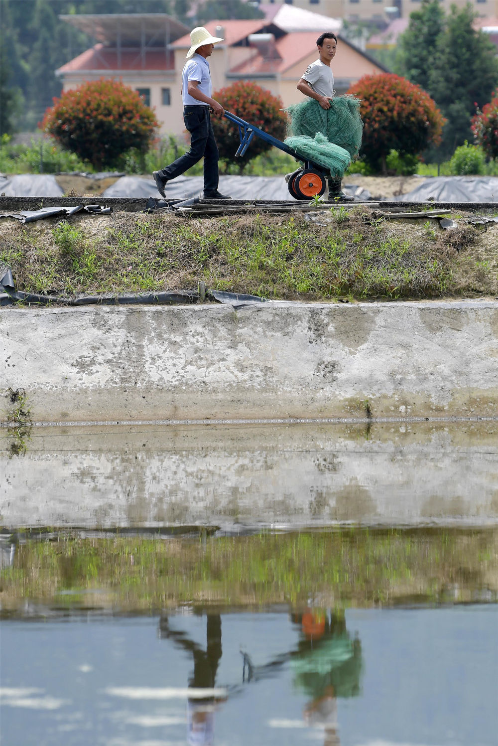 在江西省修水縣黃沙鎮(zhèn)湯橋村,返鄉(xiāng)創(chuàng)業(yè)大學(xué)生李平(右)和水產(chǎn)合作社的工作人員準(zhǔn)備去放對蝦蝦苗。他創(chuàng)辦的水產(chǎn)合作社幫助周邊村民就業(yè)(5月20日攝)。新華社記者 彭昭之 攝