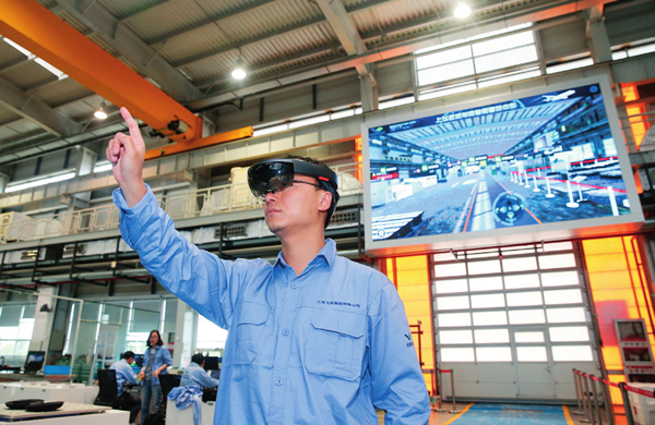 工作人員在中國(guó)商飛公司總裝制造中心智慧數(shù)控車(chē)間使用 AR 眼鏡操控虛擬電子屏幕(2018年5月5日攝)丁汀攝