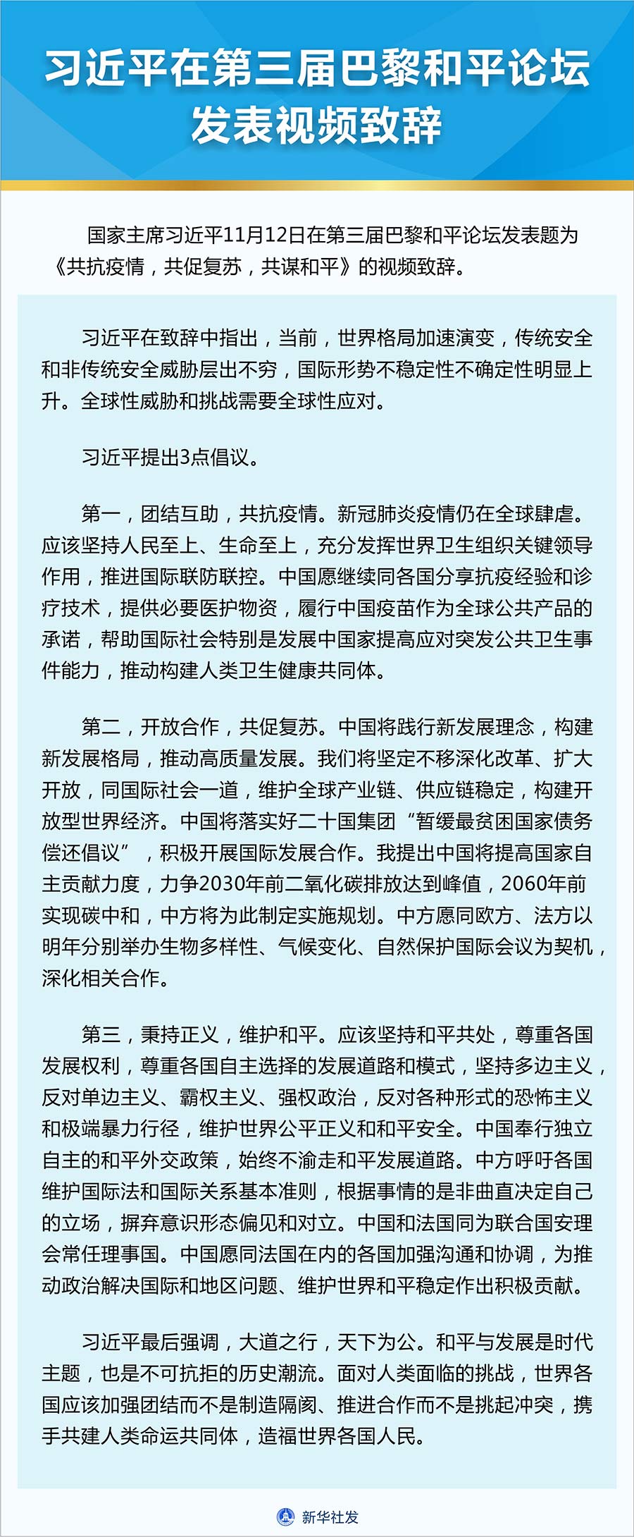 新華社北京11月12日電 國(guó)家主席習(xí)近平12日在第三屆巴黎和平論壇發(fā)表題為《共抗疫情,共促?gòu)?fù)蘇,共謀和平》的視頻致辭。