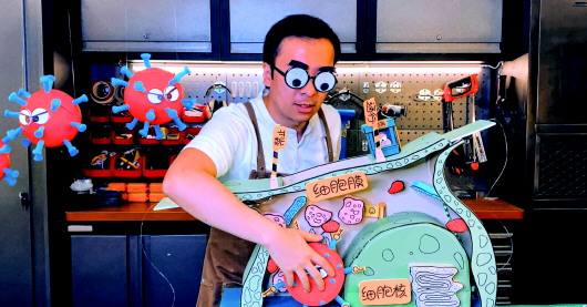 “新型冠狀病毒在細(xì)胞外面游走過(guò)程中,總能找到對(duì)應(yīng)的鎖眼,咔嚓,打開(kāi)細(xì)胞上的鎖,天真的細(xì)胞誤以為營(yíng)養(yǎng)物質(zhì)來(lái)了,于是大門敞開(kāi)……”在一個(gè)約4分鐘的視頻中,寧原在工作間的長(zhǎng)桌上用自己制作的病毒、細(xì)胞等模型,為粉絲趣味介紹新型冠狀病毒是如何入侵人體的。他還邀請(qǐng)武漢大學(xué)醫(yī)學(xué)部病毒學(xué)研究所專家來(lái)釋疑病毒變異的相關(guān)問(wèn)題,那期視頻獲得了500多萬(wàn)次觀看量。