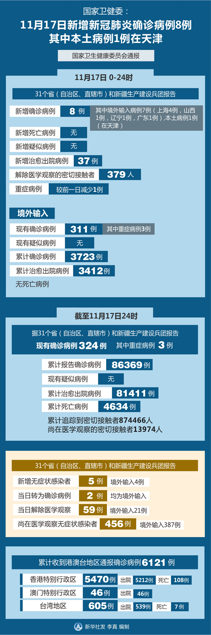 截至11月17日24時(shí),據(jù)31個(gè)省(自治區(qū)、直轄市)和新疆生產(chǎn)建設(shè)兵團(tuán)報(bào)告,現(xiàn)有確診病例324例(其中重癥病例3例),累計(jì)治愈出院病例81411例,累計(jì)死亡病例4634例,累計(jì)報(bào)告確診病例86369例,無(wú)現(xiàn)有疑似病例。累計(jì)追蹤到密切接觸者874466人,尚在醫(yī)學(xué)觀察的密切接觸者13974人。