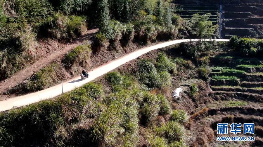 在江西省萬載縣高村鎮(zhèn)新竹村,新竹小學(xué)的校長羅長石騎行在山路上(2月17日攝,無人機照片)。他要去最偏遠(yuǎn)的村組,給學(xué)生送當(dāng)天的線上教學(xué)課程。新華社記者 彭昭之 攝