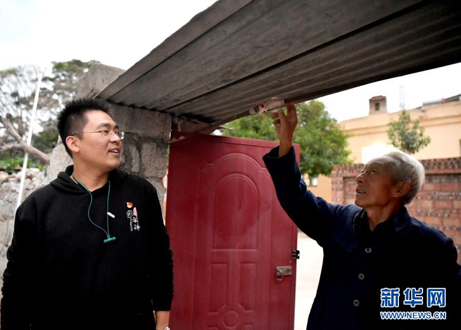 牛橫嶺村村民牛天保(右)將自家門梁掰成拱形并用布條包住,以防田昕進(jìn)門時碰到頭(10月12日攝)。新華社記者 李嘉南 攝
