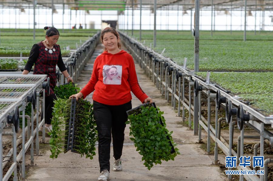 在新疆阿克陶縣現代設施農業(yè)產業(yè)扶貧基地,工人在育苗溫室內搬運菜苗(3月22日攝)。新華社記者 丁磊 攝