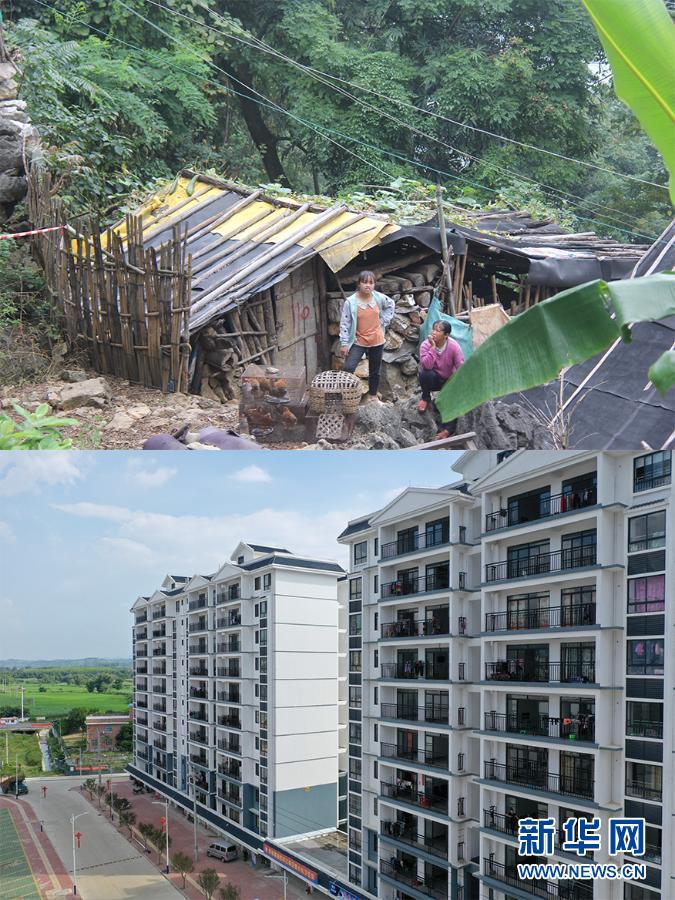 這是一張拼版照片,上圖為:2018年11月11日在廣西田東縣思林鎮(zhèn)龍邦村拍攝的村民和自家簡(jiǎn)陋的房屋(思林鎮(zhèn)政府供圖);下圖為:2019年8月28日拍攝的當(dāng)?shù)貫辇埌畲逍陆ǖ奈挥趶V西田東縣思林鎮(zhèn)的易地扶貧搬遷安置點(diǎn)(無(wú)人機(jī)照片,新華社記者 曹祎銘 攝)。新華社發(fā)