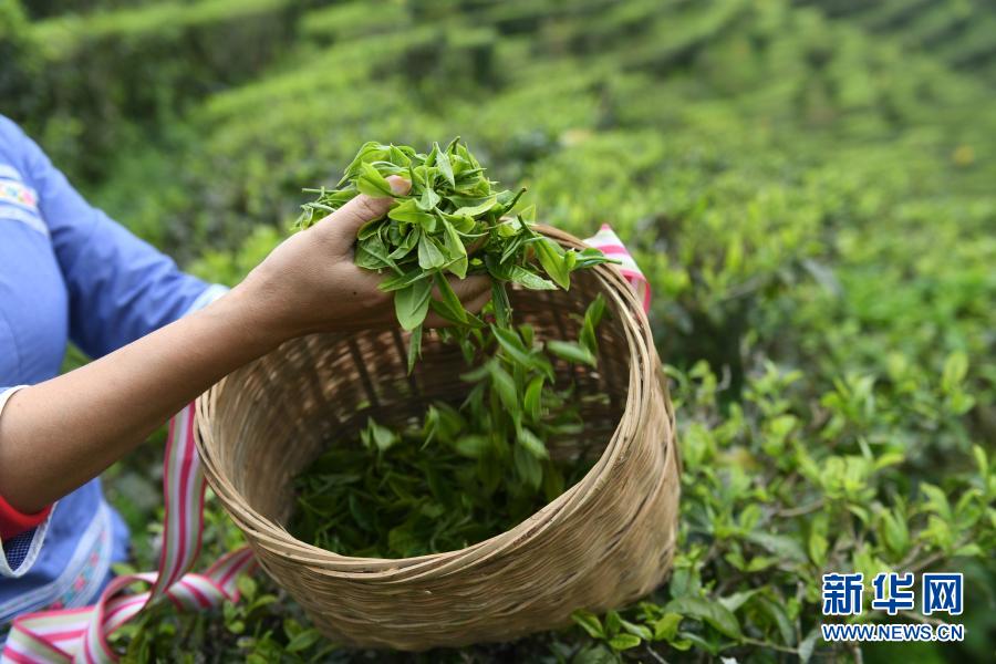 在廣西百色市凌云縣一處有機(jī)茶園,當(dāng)?shù)夭柁r(nóng)在采春茶(2019年3月27日攝)。新華社記者 陸波岸 攝