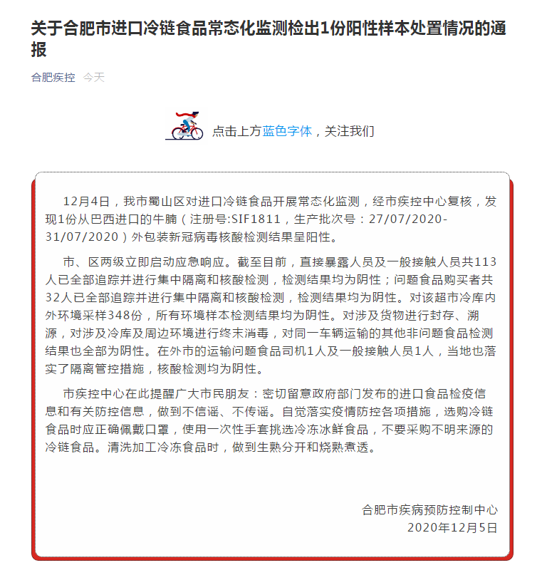 12月4日,合肥市蜀山區(qū)對進(jìn)口冷鏈?zhǔn)称烽_展常態(tài)化監(jiān)測,經(jīng)市疾控中心復(fù)核,發(fā)現(xiàn)1份從巴西進(jìn)口的牛腩(注冊號:SIF1811,生產(chǎn)批次號:27/07/2020-31/07/2020)外包裝新冠病毒核酸檢測結(jié)果呈陽性。