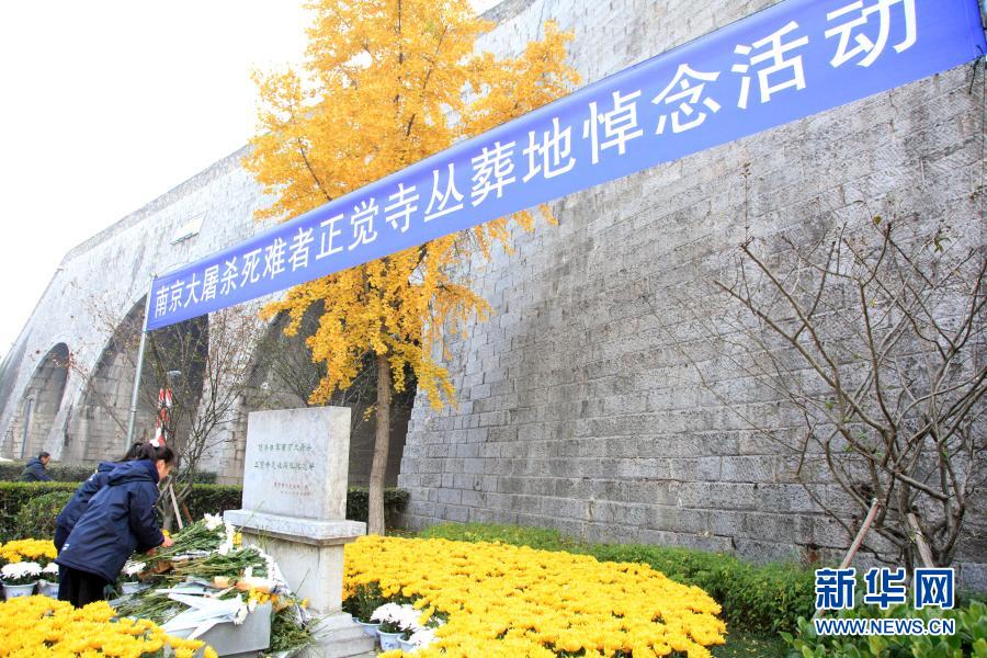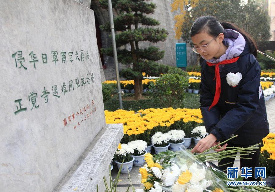 12月12日,在侵華日軍南京大屠殺死難同胞叢葬地(正覺(jué)寺),參加悼念活動(dòng)的小學(xué)生向遇難同胞紀(jì)念碑獻(xiàn)花。新華社發(fā)(劉建華 攝)