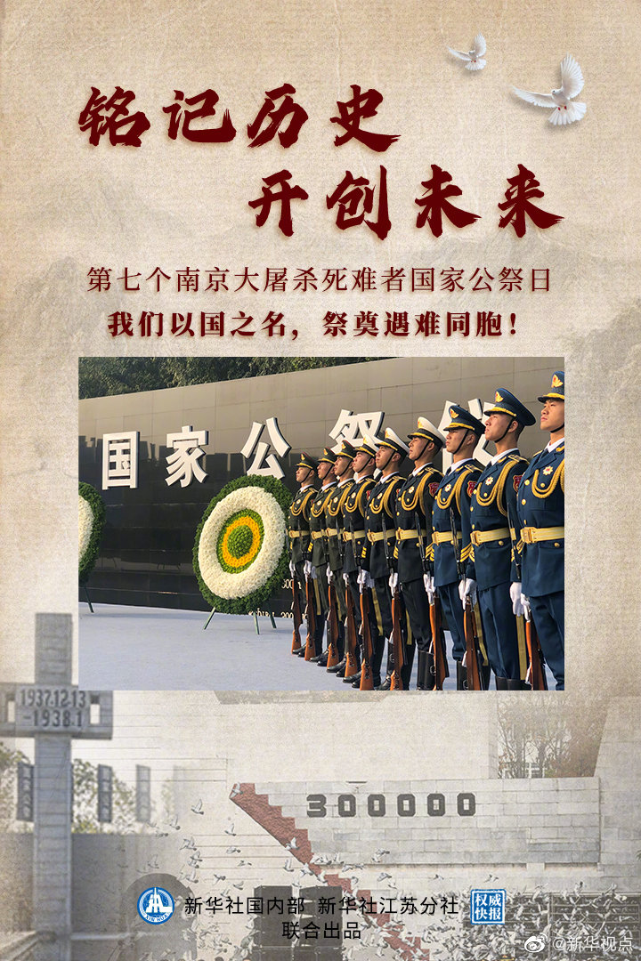 今天是第七個南京大屠殺死難者國家公祭日,讓我們銘記83年前的12月13日,沉痛緬懷30萬遇難同胞,警鐘長鳴,珍愛和平?。ㄓ浾撸菏Y芳、李響、邱冰清 海報設計:張惠慧) ????