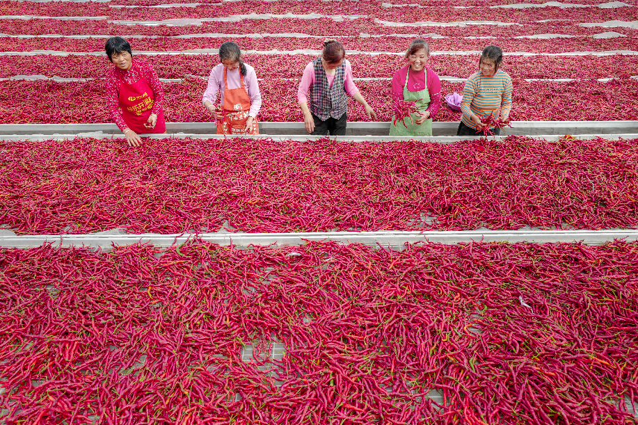 ??????2020年拍攝于陜西興平桑鎮(zhèn)西橋村金鵬辣蒜專業(yè)合作社,農(nóng)民將辣椒揚起晾曬。(組照4)張綺云 攝