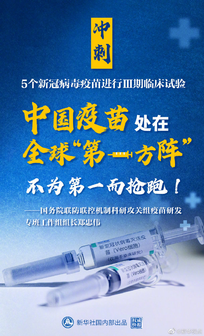 “我國目前已有5個新冠病毒疫苗進(jìn)行Ⅲ期臨床試驗(yàn),數(shù)量位于全球前列?!眹鴦?wù)院聯(lián)防聯(lián)控機(jī)制科研攻關(guān)組疫苗研發(fā)專班工作組組長鄭忠偉接受新華社記者專訪時說,“疫苗研發(fā)已經(jīng)進(jìn)入沖刺階段,我們處于全球第一方陣,但不為第一而搶跑。”“評價一個疫苗需要多項綜合指標(biāo),其中安全性、有效性、可及性、可負(fù)擔(dān)性是最重要的?!保ㄓ浾撸宏惙?、董瑞豐 海報設(shè)計:張惠慧)