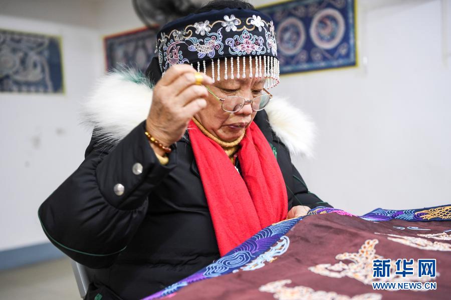 從前掩藏在深山之中的仫佬族刺繡技藝,跟隨著脫貧攻堅的腳步,走進縣城易地扶貧搬遷安置點,成為扶貧車間內(nèi)帶動貧困戶增收致富的一門本領(lǐng)。63歲的自治區(qū)級仫佬族刺繡代表性傳承人謝秀榮,多年來見證著仫佬山鄉(xiāng)的喜人變化。她精心繡制了一幅《全面奔向小康》馬尾繡作品,以藍靛染布為底色的畫面上,仫佬族群眾拿著紅旗,向著太陽走去。