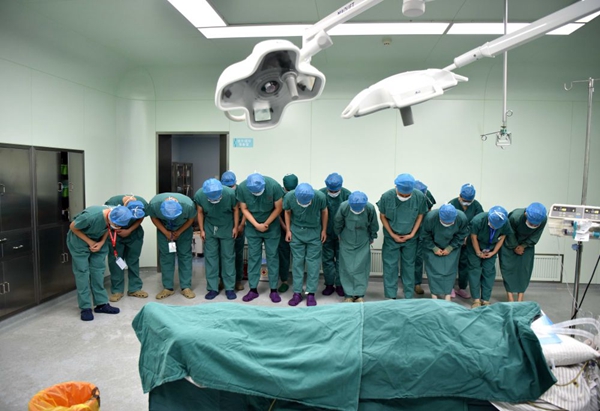 ▲ 2016年9月29日,在安徽省立醫(yī)院,工作人員向志愿捐獻(xiàn)器官的41歲援藏醫(yī)生趙炬的遺體告別。新華社發(fā) 周誠攝