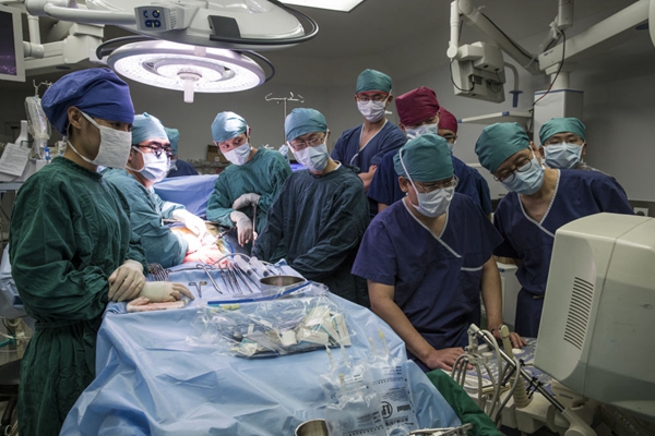 ▲ 2016年12月21日,首都醫(yī)科大學(xué)附屬北京友誼醫(yī)院肝移植中心主任朱志軍教授(右二)和團(tuán)隊(duì)成員一起為肝糖原累積癥患兒昊昊進(jìn)行親體肝臟移植手術(shù)。新華社記者 沈伯韓攝