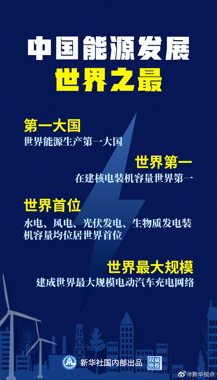 根據(jù)國務(wù)院新聞辦公室21日發(fā)布的《新時代的中國能源發(fā)展》白皮書,中國能源發(fā)展有多個世界之最:初步核算,2019年中國一次能源生產(chǎn)總量達(dá)39.7億噸標(biāo)準(zhǔn)煤,為世界能源生產(chǎn)第一大國;截至2019年底,在運(yùn)在建核電裝機(jī)容量6593萬千瓦,居世界第二,在建核電裝機(jī)容量世界第一;截至2019年底,水電、風(fēng)電、光伏發(fā)電、生物質(zhì)發(fā)電裝機(jī)容量分別達(dá)3.56億千瓦、2.1億千瓦、2.04億千瓦、2369萬千瓦,均位居世界首位;截至2019年底,全國電動汽車充電基礎(chǔ)設(shè)施達(dá)120萬處,建成世界最大規(guī)模充電網(wǎng)絡(luò)。(記者:劉羊旸 海報設(shè)計(jì):張晨光)
